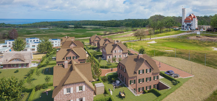 In a dreamlike location and surrounded by a picturesque backdrop, the "Reetdachvillen am Schloss" are being built directly at Ranzow Castle on the holiday island of Rügen with 16 semi-detached holiday homes. Premium quality, an idyllic location and exclusive facilities come together here.