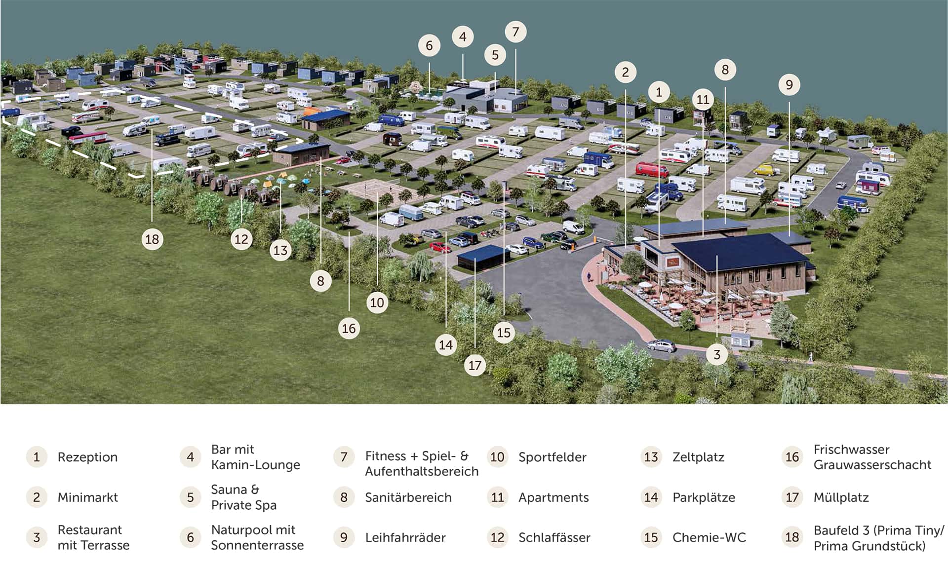Die gesamte Infrastruktur des Prima Resorts können Sie dabei bequem mitnutzen – von Pool über Sauna und Minimarkt bis Restaurant.