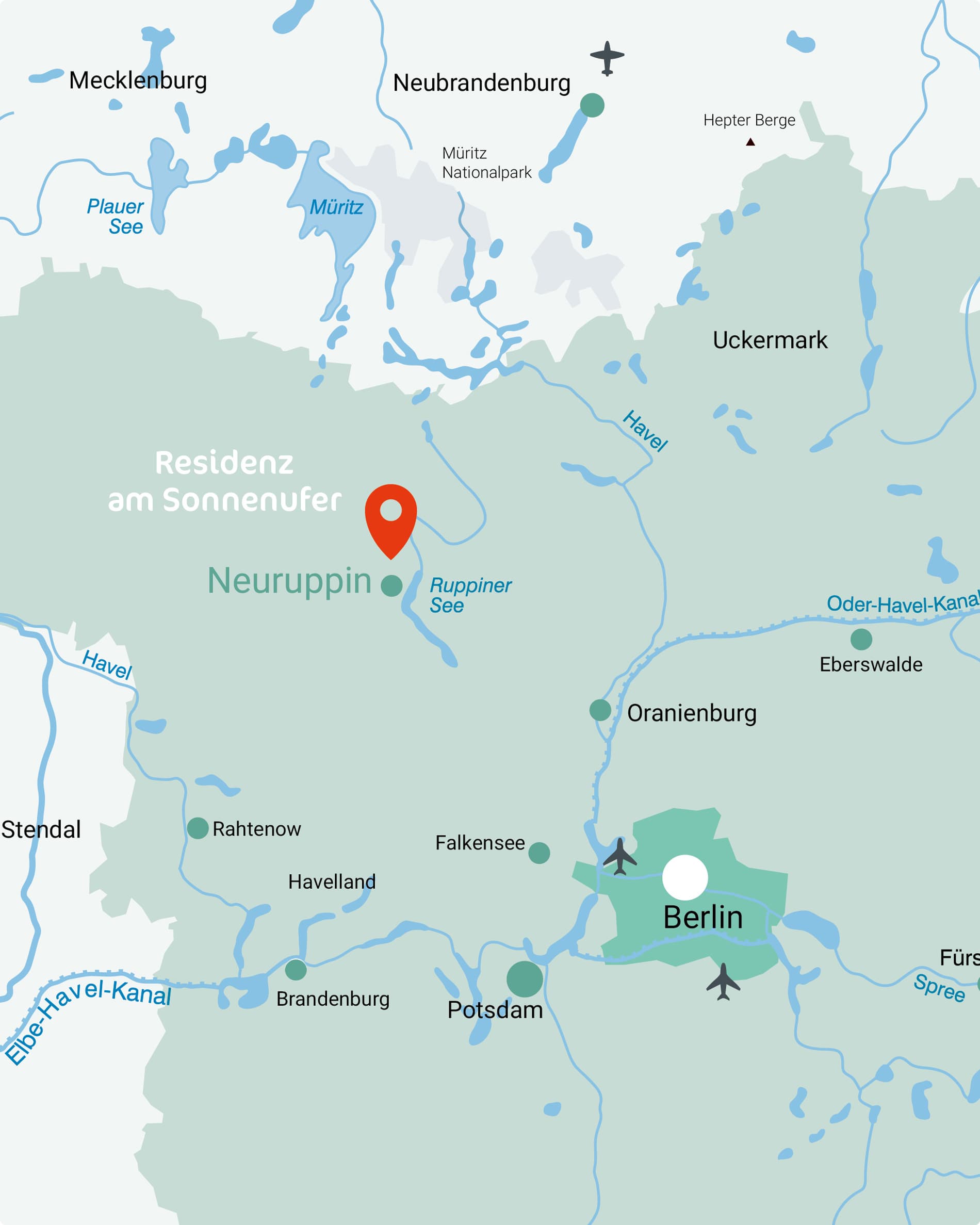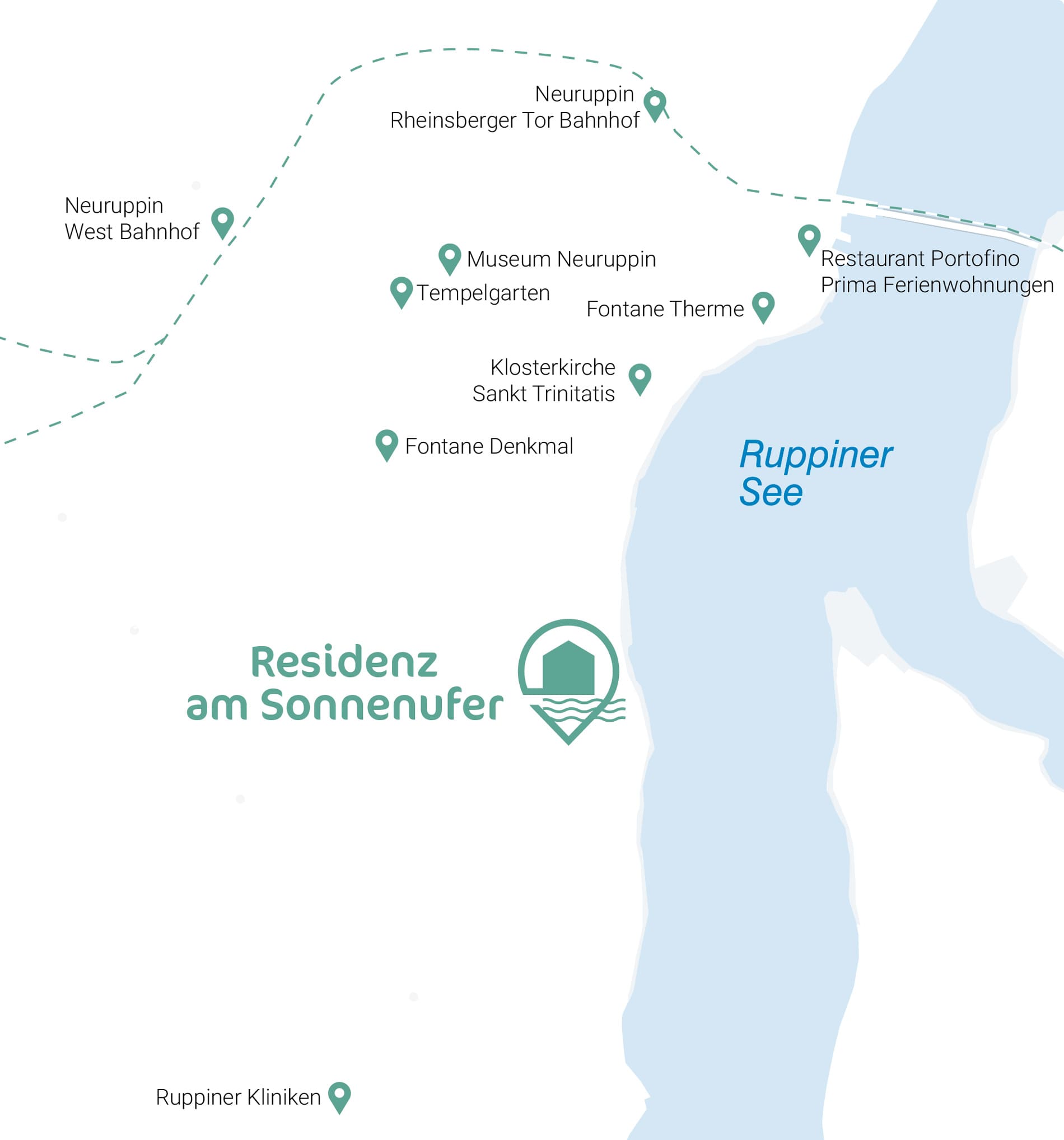 Alles, was Sie und Ihre Feriengäste für das tägliche Leben brauchen, ist fußläufig entfernt von der neuen Residenz am Sonnenufer. Direkt vor Ort gibt es Einkaufsmöglichkeiten und in zehn Minuten sind Sie zu Fuß im charmanten Stadtzentrum von Neuruppin mit seinen vielen Restaurants, Cafés und Geschäften.