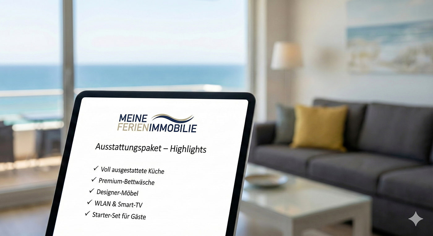 - Sie statten Ihre Ferienimmobilien mit einer wertigen Möblierung und Standards aus, die Ihren Gästen einen angenehmen Aufenthalt sichern. Dazu gehören z. B. WLAN, TV-Empfang, eine Basisausstattung usw. - alles übliche Dinge, die Sie als Gast in einer hochwertigen und neu erstellten Ferienwohnung ebenfalls erwarten würden.