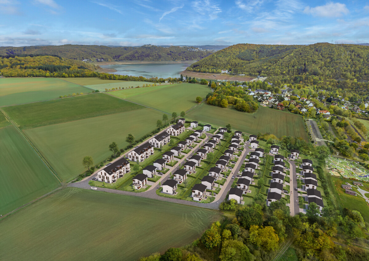 Die Wohnungen befinden sich in einem modernen Ferienquartier in sonniger Hanglage oberhalb des Edersees. Von hier aus eröffnet sich ein weiter Blick über Felder, Wälder und die ruhige Mittelgebirgslandschaft des Natur- und Nationalparks Kellerwald-Edersee. Die Nähe zum See – fußläufig erreichbar – macht die Lage ideal für Wassersport, Radfahren, Wandern oder entspannte Spaziergänge entlang der Uferlinien.